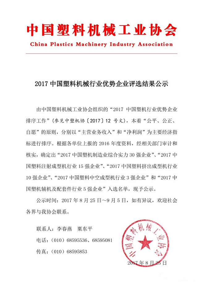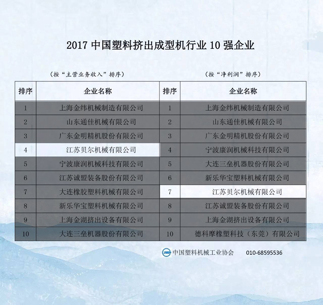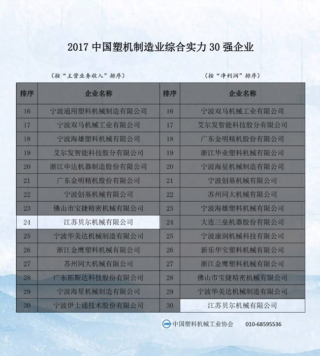 2017中國塑料機(jī)械行業(yè)優(yōu)勢(shì)企業(yè)的排名公示,江蘇貝爾機(jī)械榮獲中國擠出成型機(jī)行業(yè)前4強(qiáng),塑機(jī)行業(yè)前24強(qiáng)榮譽(yù)稱號(hào)!