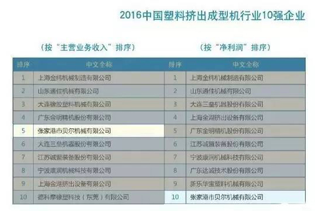 2017年,公司的實(shí)力不斷提升,排名不斷靠前。與去年相比,從中國塑料擠出成型機(jī)行業(yè)按"主營業(yè)務(wù)收入"排序的第五名提升為第四名、按"凈利潤"排序的第十名提升為第七名。